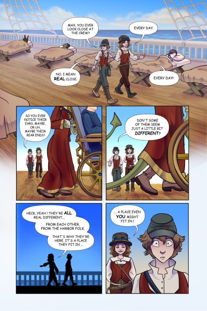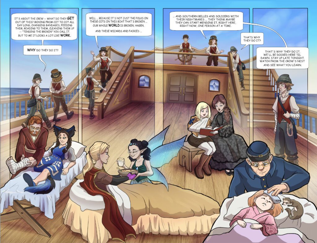 This is a scene from early in the story. In a harbor town, a thief is beaten and left for dead. A mysterious figure appears and takes him aboard a ship at anchor by the dock. Art by Christy McCulfor.